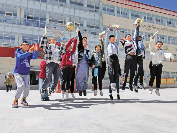 圖為結(jié)束藏語文考試的考生慶祝高考結(jié)束。來源:西藏日報 攝影:王莉