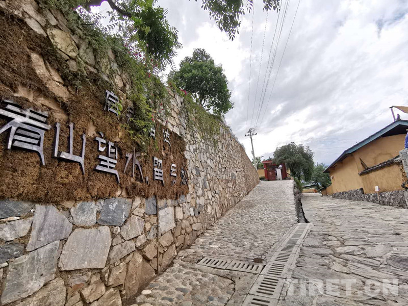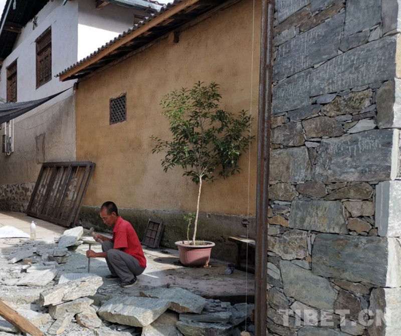 漫步村間,石板鋪就的道路縱橫交錯(cuò),與居民房舍相連。鳥語(yǔ)蟬鳴,人與自然在這里和諧共生。遠(yuǎn)處傳來(lái)石頭的敲擊聲,沿石板路而上,循聲走近,看到一位大爺在家門口敲擊著大石塊,記者便好奇地上前詢問。這位大爺告訴我們,他在修建自家的大門。