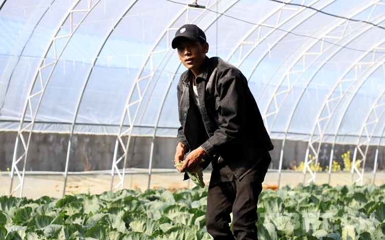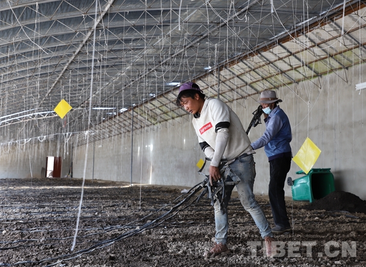 圖為扎西(左一)在大棚內(nèi)干活,準(zhǔn)備種植蓮花白