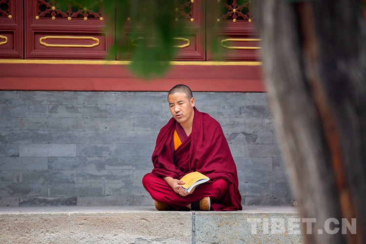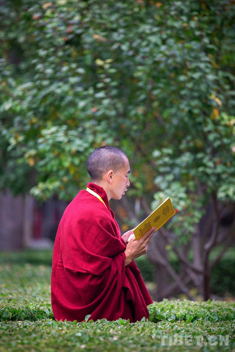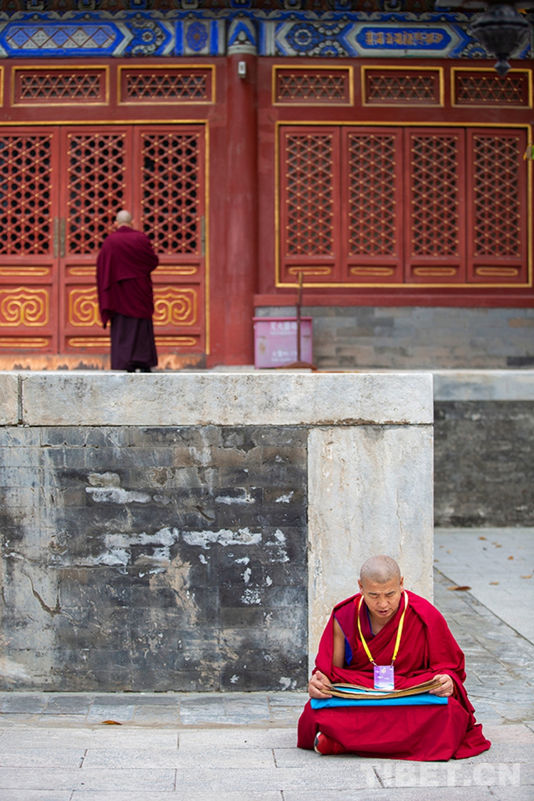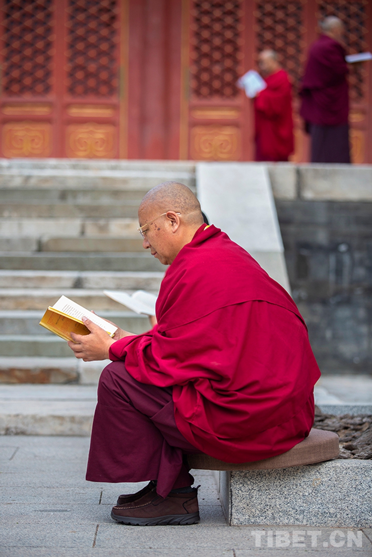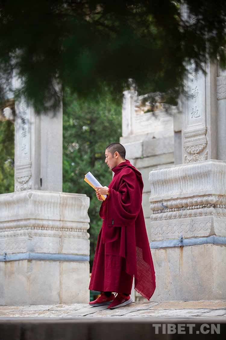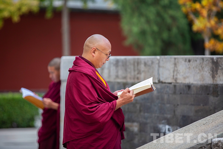 中國西藏網(wǎng)訊 10月29日,深秋的清晨,位于北京西黃寺的中國藏語系高級佛學院內(nèi),古柏蒼蒼,清凈肅穆。還有半個小時,2020年藏傳佛教第十六屆“拓然巴”高級學銜畢業(yè)考試辯經(jīng)考試就將準時開始。等待參加辯經(jīng)考試的學僧們,正在西黃寺大殿前誦經(jīng),抓緊時間為考試進行最后的準備。大家或席地而坐,或立定一隅,或踱步前行,梵唱聲聲,余音繞梁。(中國西藏網(wǎng) 攝影/許娜 編輯/周晶)