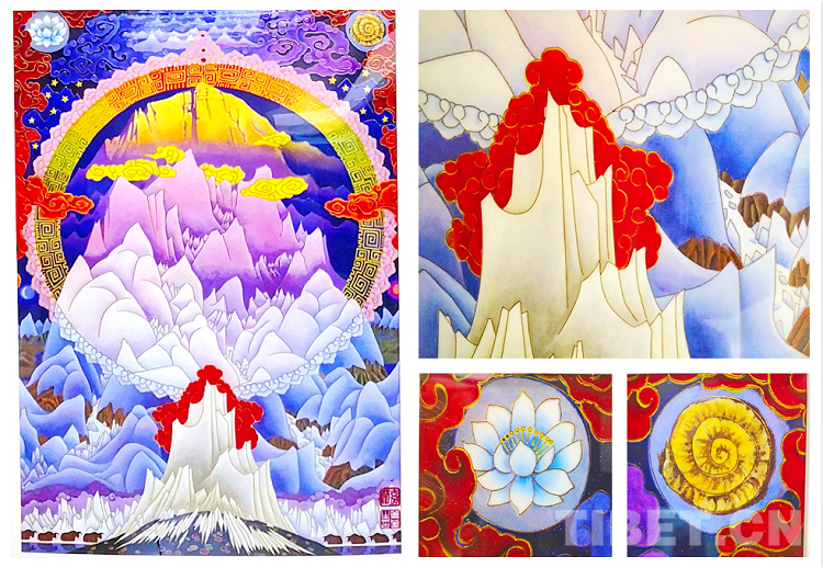 而令葉星生深受觸動的,是十世班禪大師對創(chuàng)作的關(guān)心、前衛(wèi)的創(chuàng)作思路和嚴格的要求?!笆腊喽U大師多次提出指導(dǎo)意見,鼓勵我們大膽創(chuàng)新,要融入光影等繪畫新技法及漢族傳統(tǒng)繪畫技法,使珠峰更有立體感,使畫作成為現(xiàn)代藝術(shù)技法與藏族傳統(tǒng)繪畫手法相融合的代表,成為民族團結(jié)的象征。所以,這幅畫在結(jié)構(gòu)上參考了唐卡,比如彩虹;祥云、太陽、月亮、星斗對稱的方式等來自西藏傳統(tǒng)壁畫藝術(shù);但在光線、明暗對比等方面加入了漢地工筆重彩,甚至西方的藝術(shù)手法。在天地之間以更加立體的視角展現(xiàn)出了珠峰壯麗雄偉的全景?!?/p>