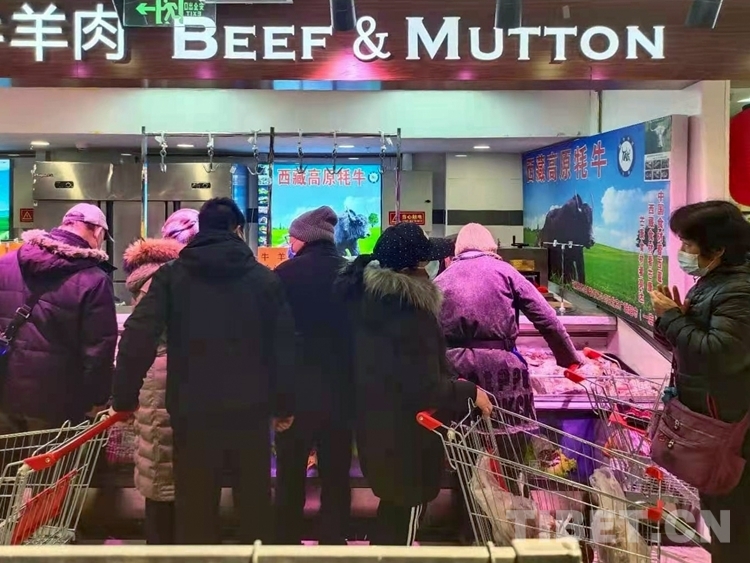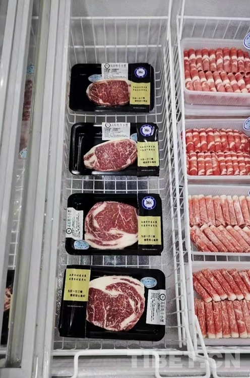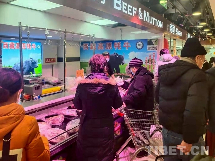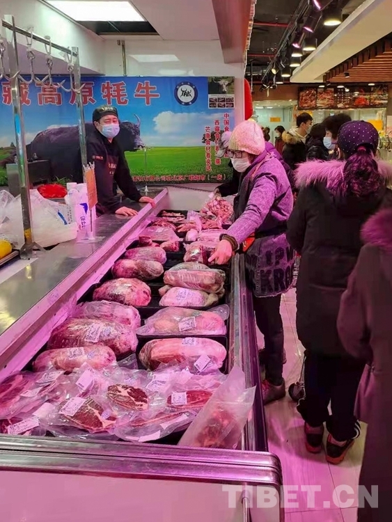 中國西藏網(wǎng)訊 近日,北京廣聯(lián)連鎖超市冷鮮肉柜臺前,購買牛肉的市民正在認真選購來自西藏昌都市芒康縣的高原牦牛肉。
