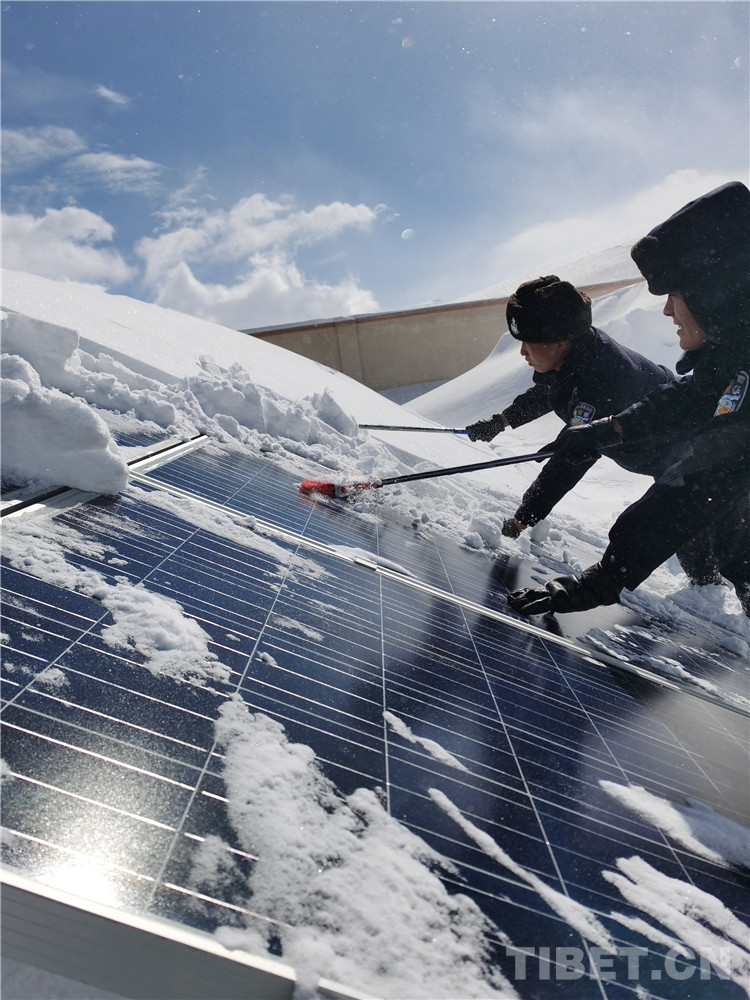 圖為民警們?cè)?019年春節(jié)前遭遇暴雪時(shí)清理太陽能電池板上的積雪
