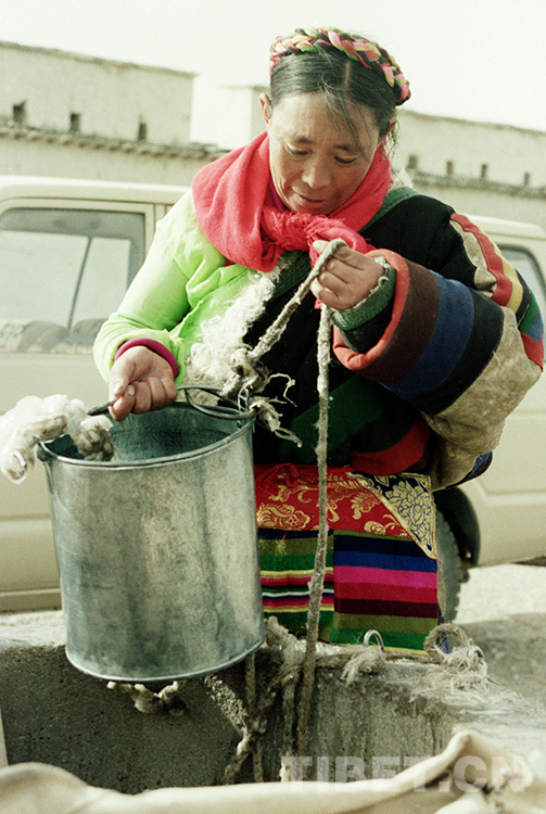 圖為文部辦事處申亞鄉(xiāng)女鄉(xiāng)長(zhǎng)卓瑪在打井水。她當(dāng)時(shí)是全國(guó)“三八”紅旗手、那曲地區(qū)唯一的女鄉(xiāng)長(zhǎng)(唐召明1989年12月攝)