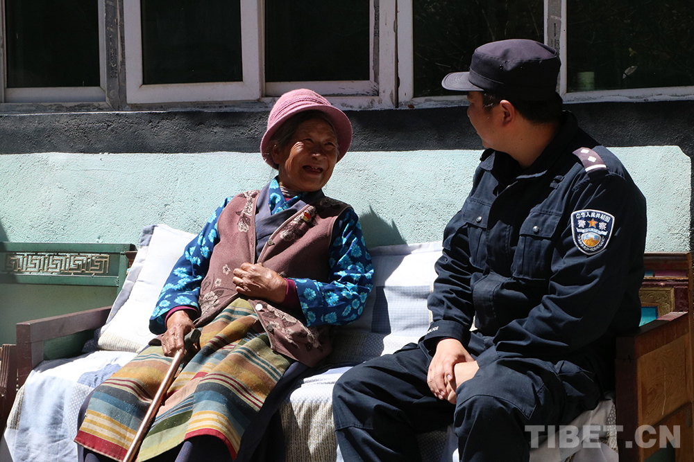 圖為林芝金東邊境派出所民警韓其辰與拉姆老阿媽在院子里聊天 攝影:徐華升