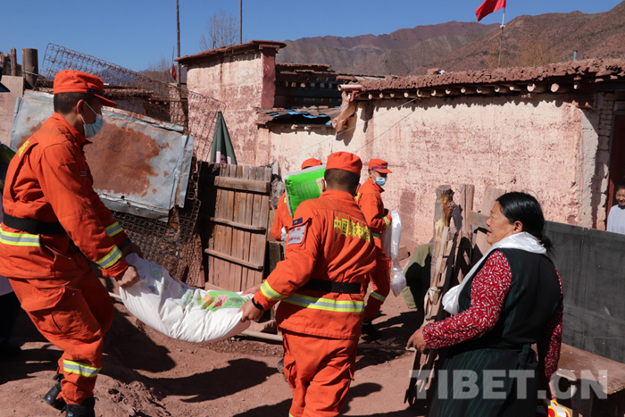 圖為卡若區(qū)森林消防中隊(duì)指戰(zhàn)員抬著慰問品送到困難群眾家中