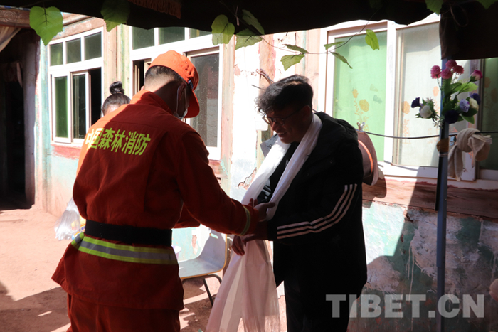 圖為卡若區(qū)森林消防中隊(duì)指戰(zhàn)員為群眾獻(xiàn)上哈達(dá)