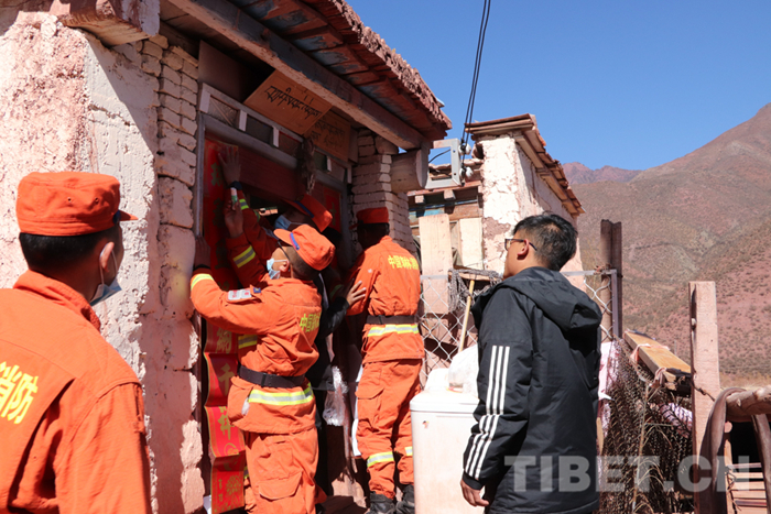 圖為卡若區(qū)森林消防中隊(duì)指戰(zhàn)員為困難群眾家里貼上春聯(lián)
