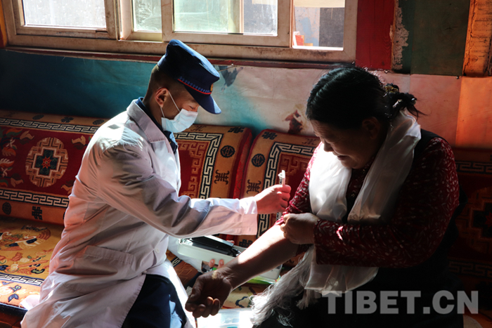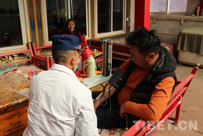 圖為卡若區(qū)森林消防中隊(duì)衛(wèi)生員了解困難群眾身體狀況