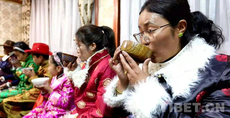圖為索南旺久一家換上節(jié)日的盛裝一起吃“古突” 攝影:吳學(xué)明