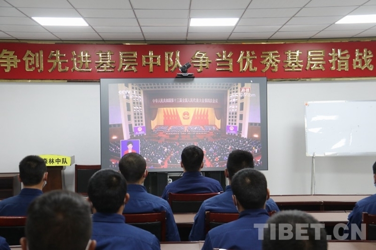 圖為昌都市左貢縣森林消防中隊(duì)隊(duì)員收看全國(guó)兩會(huì)直播