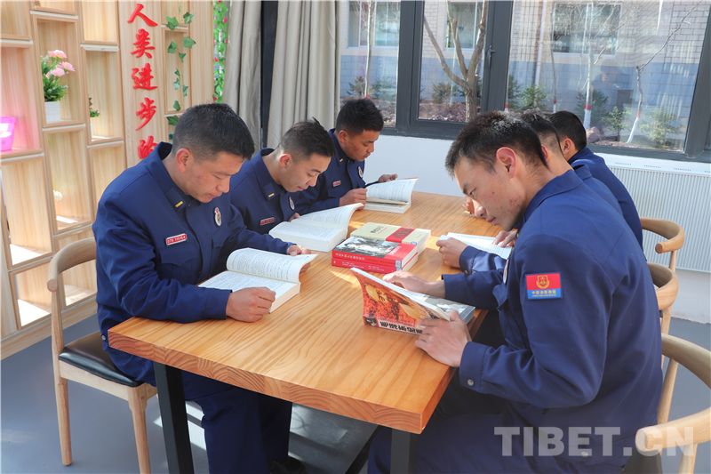 圖為西藏昌都市卡若區(qū)森林消防中隊學(xué)習(xí)黨史書籍