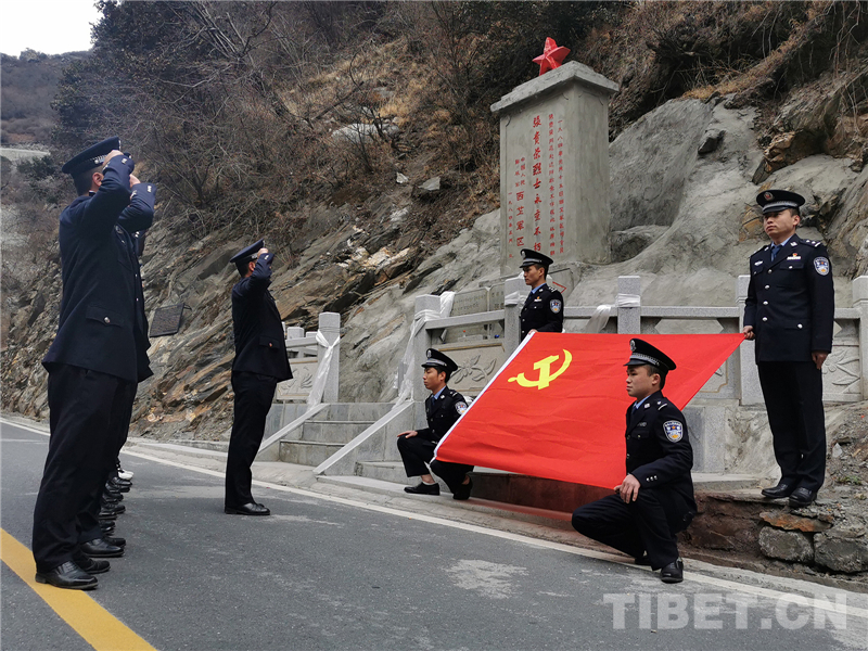在山南市,西藏山南邊境管理支隊各級組織在祖國雪域邊關(guān)開展祭掃活動。斗玉邊境派出所移民管理警察來到位于駐地邊境一線的“將軍崖”,將佇立于此的烈士紀(jì)念碑擦拭干凈,并將鮮花放置碑前,深情緬懷37年前在此巡邊時因突發(fā)重疾而獻(xiàn)出寶貴生命的原西藏軍區(qū)司令員張貴榮將軍。在紀(jì)念碑前,在黨旗之下,在群山環(huán)抱之中,移民管理警察高舉緊握的右拳,再次重溫入黨誓詞,將革命先烈的戍邊遺志與奉獻(xiàn)精神深銘心間。