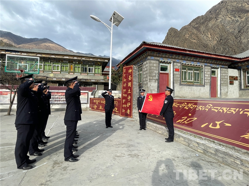 圖為臥龍邊境派出所民警與駐地工作人員進(jìn)行黨旗合影活動 攝影:陸雨林