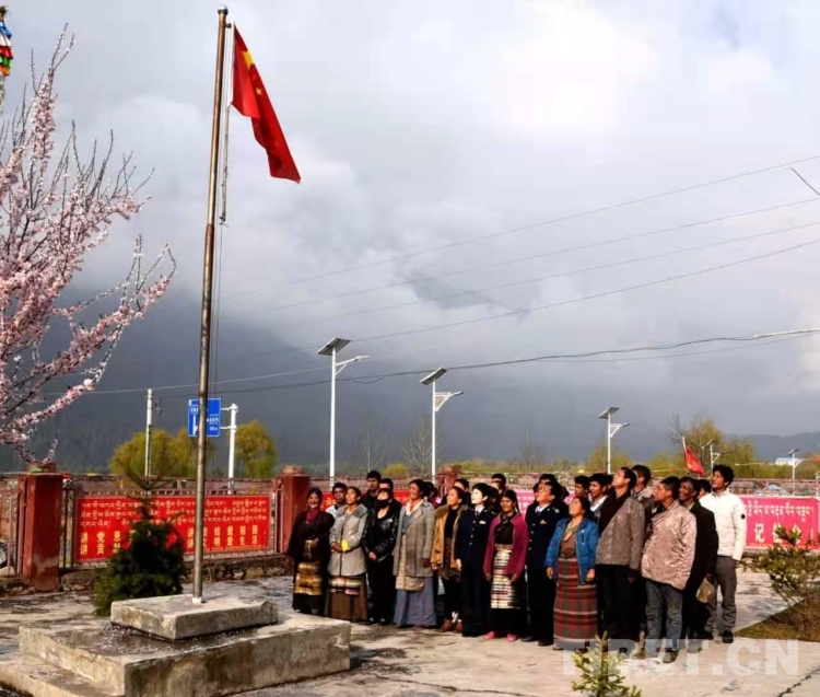 圖為稅收干部和當(dāng)?shù)厝罕娫谖鞑刈灾螀^(qū)日喀則市吉隆鎮(zhèn)達曼村開展升國旗儀式