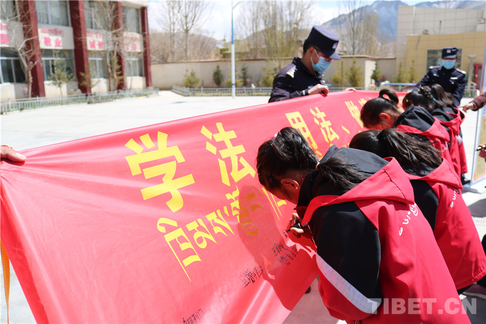 圖為南尼邊境派出所民警組織南尼中心小學(xué)學(xué)生進(jìn)行簽名。旦增白瑪 攝