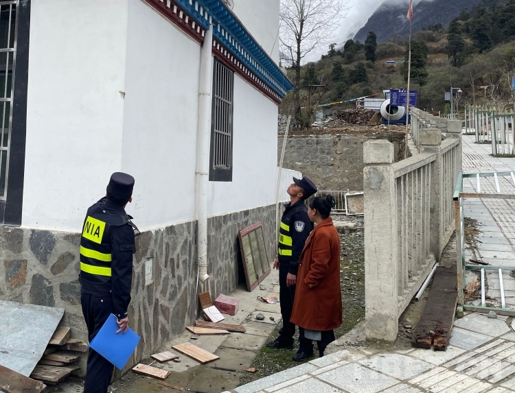 圖為西藏山南邊境管理支隊浪坡邊境派出所民警對邊民群眾住宅進行震后排查