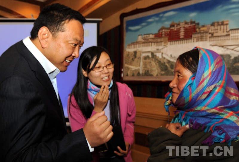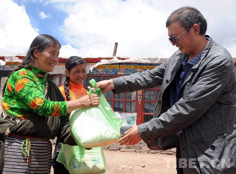 這是時(shí)任班戈縣副縣長(zhǎng)的李正斌看望曾罹患巨大腫瘤的牧女斯求卓瑪,為她送去糧油等慰問品(唐召明2012年8月3日攝)