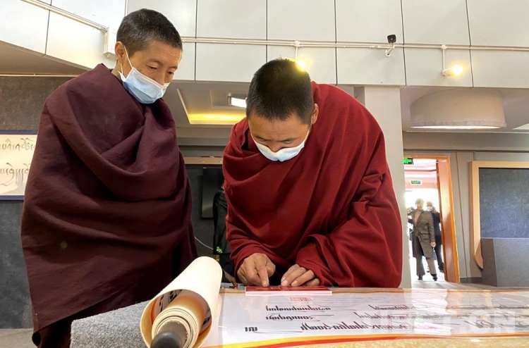 圖為2021年5月,“同心共筑中國夢(mèng)”——西藏僧尼群眾書法精品展現(xiàn)場,僧尼正在觀看展現(xiàn)了烏金體、朱匝體等20余種風(fēng)格迥異的藏文書法體系的書法作品《藏文字體大全》 攝影:王媛媛