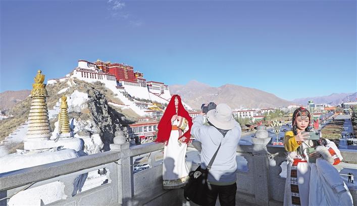 圖為游客在布達(dá)拉宮前拍照留念。記者 格桑倫珠 攝 圖片來源:西藏日報