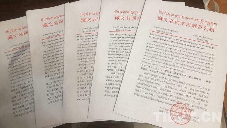 西藏自治區(qū)新詞術(shù)語藏文翻譯規(guī)范委員會每年收集、整理、審定不少于600條,每月召開一次審定會及時進(jìn)行審定規(guī)范。審定通過的規(guī)范術(shù)語以公報活頁形式呈西藏自治區(qū)省級負(fù)責(zé)同志,報送全國藏語術(shù)語標(biāo)準(zhǔn)化委員會,下發(fā)區(qū)內(nèi)各地市編譯機(jī)構(gòu)和區(qū)直新聞、院校等各有關(guān)單位及部分專家,發(fā)送到涉藏州縣編譯系統(tǒng)、民語委和北京等地有關(guān)藏語文部門,同時刊登在西藏藏語言文字網(wǎng)、中國藏語廣播網(wǎng)等藏文網(wǎng)站和報刊。