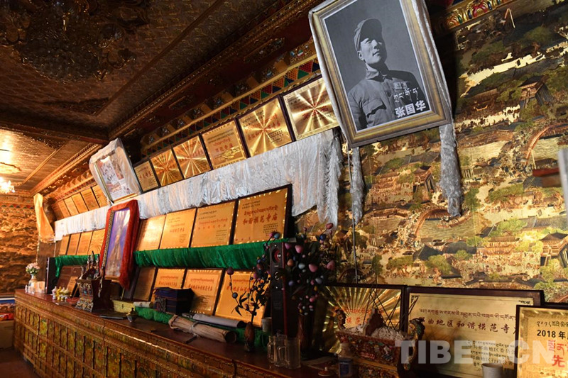 圖為寺廟懸掛著西藏自治區(qū)級、市級、縣級和諧模范寺廟、愛國愛教寺廟等榮譽(yù)獎牌,以及前西藏軍區(qū)司令員、十八軍軍長張國華的照片 攝影:索南多杰