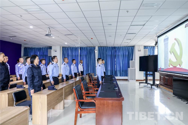 圖為拉薩鐵路公安處民警通過直播與大會(huì)現(xiàn)場(chǎng)同唱《國(guó)際歌》 攝影:黃飛
