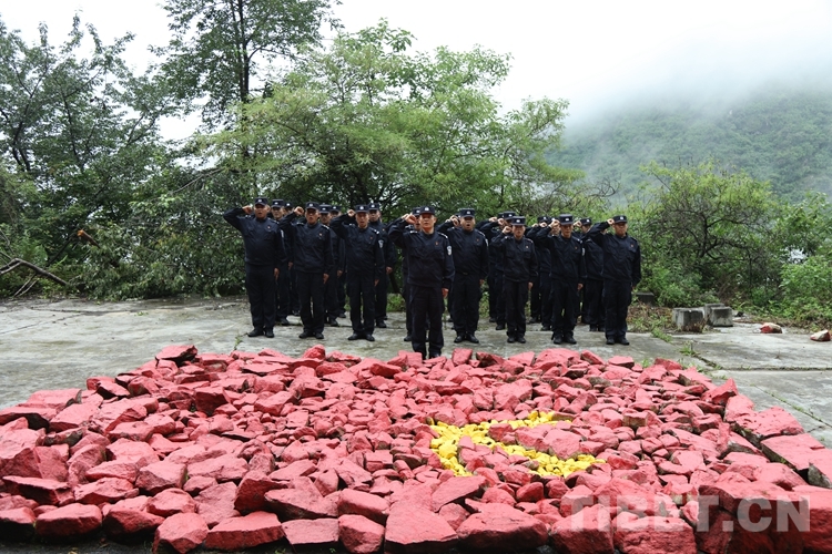 圖為機關民警在石頭堆砌的黨旗前重溫入黨誓詞 攝影:鄒興國