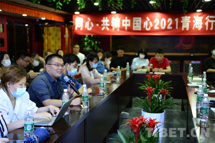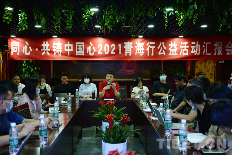 圖為“同心·共鑄中國心”組委會項(xiàng)目辦公室主任薛艷斌行前介紹果洛州具體情況