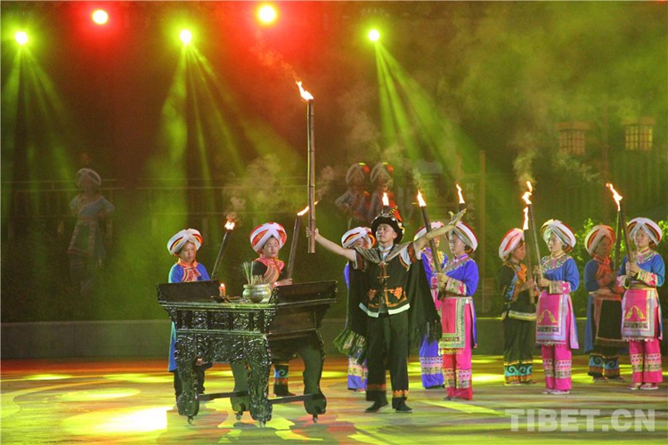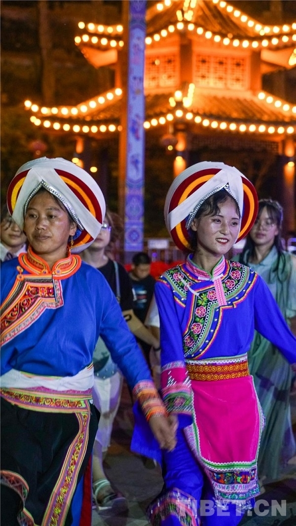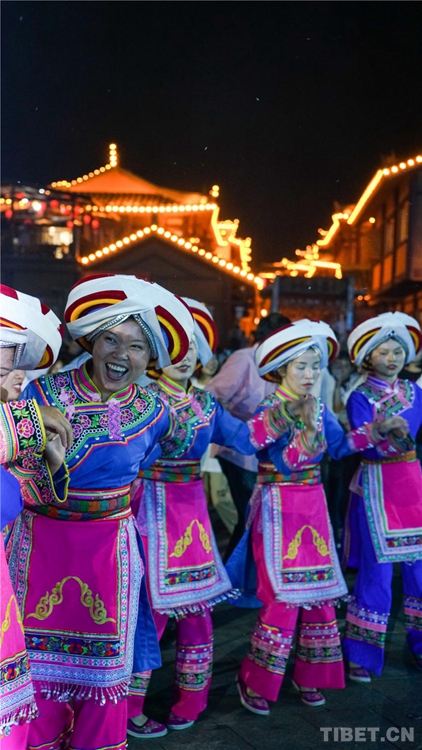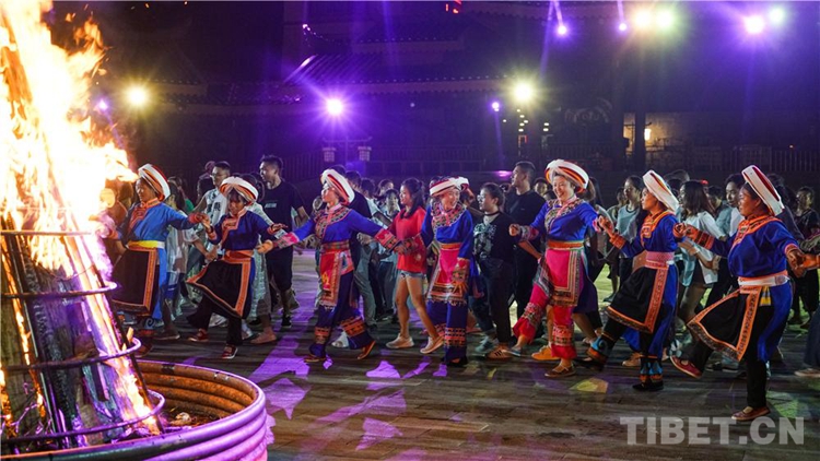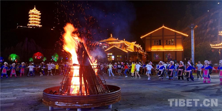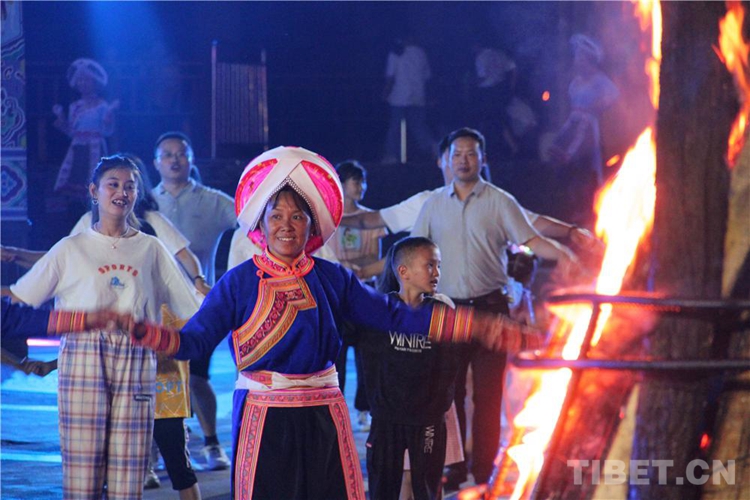 中國(guó)西藏網(wǎng)訊 當(dāng)陣陣涼風(fēng)襲來,暑氣漸消,暮靄沉沉。碧水青山環(huán)抱的阿妹戚托小鎮(zhèn)卻漸漸躁動(dòng)起來,熱騰的火苗將夏夜“點(diǎn)燃”,人們環(huán)繞火把載歌載舞、歡唱高歌,沉醉其中、樂而忘返。