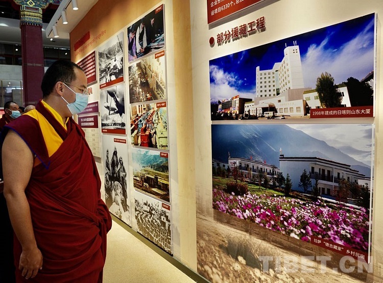 《十七條協(xié)議》簽訂、西藏自治區(qū)第一次人民代表大會召開、習(xí)近平總書記來信、對口援藏資金圖表……一幅幅圖片、一份份史料將西藏和平解放70年來,西藏從黑暗走向光明、從落后走向進(jìn)步、從貧窮走向富裕、從專制走向民主、從封閉走向開放的歷史生動地呈現(xiàn)出來。班禪不時駐足觀看,詳細(xì)詢問有關(guān)情況,對西藏近年來各項事業(yè)取得的成就予以充分肯定。