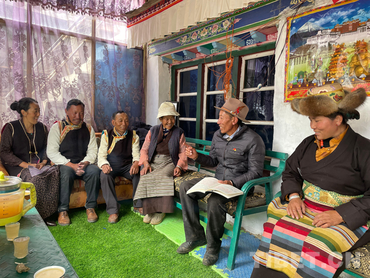 圖為索朗頓珠進(jìn)農(nóng)戶宣講黨史知識(shí)