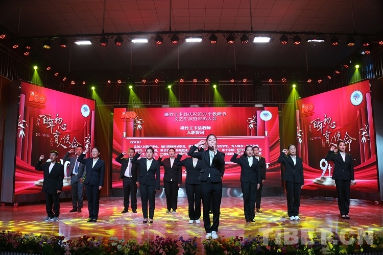 老前輩們的諄諄教誨,激勵著莘莘學(xué)子健康成長。他們勤勤懇懇做事、踏踏實實做人的優(yōu)良作風(fēng),也讓青年教師頗受觸動。墨竹工卡縣今年新入職的13位教師走上舞臺,舉起右手,面對墨竹工卡縣各族各界代表及師生代表許下他們的鏗鏘誓言。