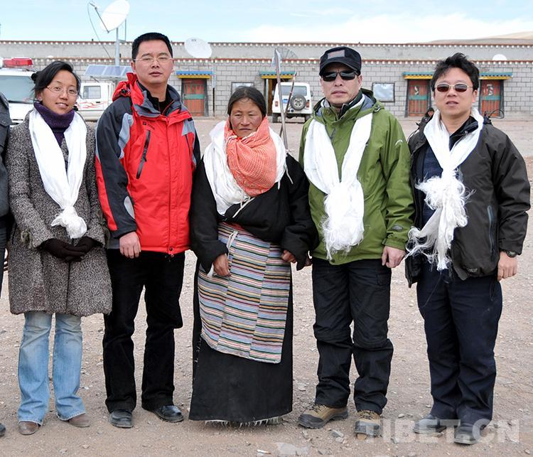 圖為中國石化第五批援藏干部、班戈縣副書記陳志清(左二)和常務副縣長潘峰(右一)專程到班戈縣新吉鄉(xiāng)接脖子下長著巨大腫瘤的牧女斯求卓瑪進京治病時,在鄉(xiāng)政府一同合影留念(王普2010年3月26日攝)