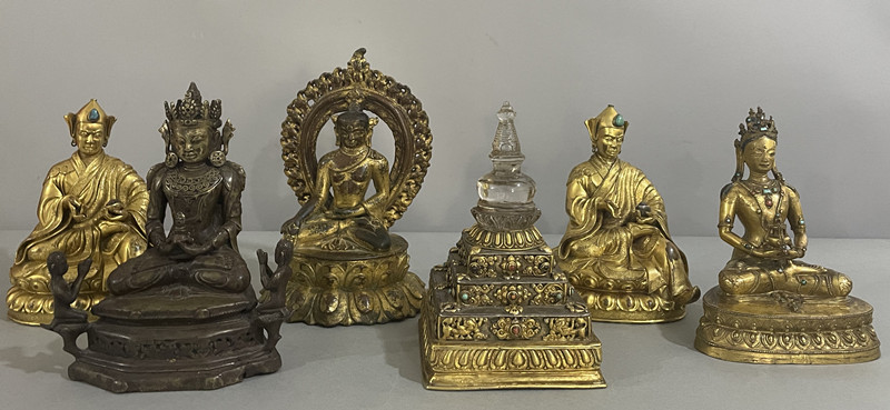 其中,5件金銅佛造像和1件銅鎏金水晶嵌寶石供養(yǎng)塔制作工藝精良,專家建議暫定為三級文物。特別是1尊明末清初的黃銅同侍從無量壽佛造像,呈現(xiàn)出顯著漢藏融合風格,其六面形臺座多見于漢藏風格唐卡與壁畫,在銅造像中較為罕見。