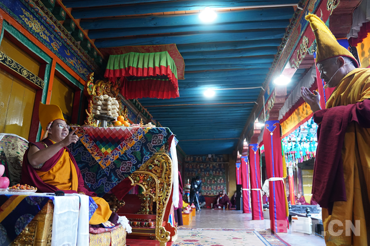 下午4點,日喀則碧空如洗、風(fēng)和日暄,僧眾齊聚扎什倫布寺多加大院,開始共同誦念《度母經(jīng)》《皈依心經(jīng)》《頌度母經(jīng)》《大白傘蓋經(jīng)》《波羅蜜多心經(jīng)》,隨著法螺、法號響起,班禪由手持香爐和吹嗩吶僧人引路、手持黃傘的僧人護(hù)送,緩緩步入多加大院,登上寶座,同僧眾共同誦念經(jīng)典?,F(xiàn)場法號聲聲、梵音裊裊,場面莊嚴(yán)而隆重。
