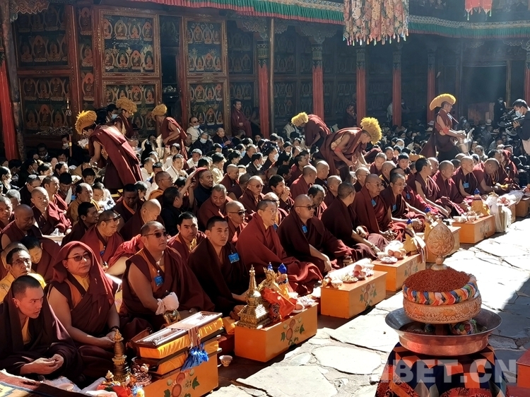 上午10時,隨著法號響起,領(lǐng)經(jīng)師領(lǐng)經(jīng)下僧眾開始集體誦經(jīng),班禪由手持香爐和吹嗩吶僧人引路來到扎什倫布寺多加大院。慶祝儀式上,扎什倫布寺高僧活佛、各寺廟僧尼代表及班禪親屬依次敬獻(xiàn)曼扎、禮品。同時,扎什倫布寺僧人在會場上以辯經(jīng)、跳“卡爾”舞等方式祝賀,并向現(xiàn)場信教群眾發(fā)放酥油茶、人參果、八寶飯等,共沾法喜。場面恢宏,恭敬威儀。