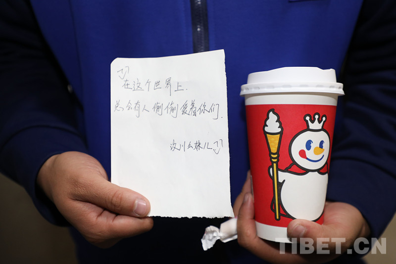 抱著這個(gè)還有溫度的大箱子,楊文武趕緊報(bào)告了指導(dǎo)員楊路路。打開(kāi)箱子后,發(fā)現(xiàn)是整整齊齊60杯熱騰騰的奶茶。茶杯上留著一張小紙條,寫著“在這個(gè)世界上,總會(huì)有人偷偷愛(ài)著你們”,落款人“汶川幺妹兒”。指導(dǎo)員和楊文武恍然大悟,肯定是一位熱心的女孩匿名買了奶茶,又讓這對(duì)外賣夫婦送過(guò)來(lái)的。只是不知道是哪位暖心的女孩送了奶茶,因?yàn)闆](méi)有留下任何聯(lián)系方式,也沒(méi)有透露自己的真實(shí)姓名。