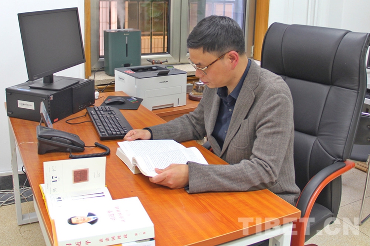 圖為張?jiān)姼咴谵k公室學(xué)習(xí) 攝影:周晶