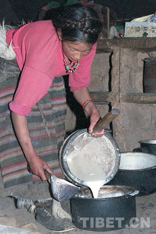 這是那曲地區(qū)(現(xiàn)那曲市)班戈縣牧女正在倒用木桶打過(guò)的牦牛奶,準(zhǔn)備熬制酥油(唐召明1987年攝)