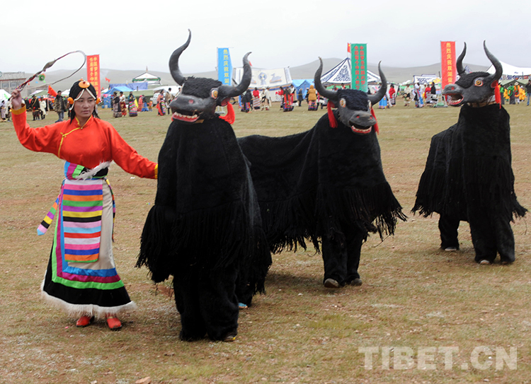 這是在那曲地區(qū)雙湖特別區(qū)(現(xiàn)那曲市雙湖縣)“撤區(qū)建縣”慶祝活動(dòng)上表演的“牦?!蔽瑁ㄌ普倜?013年7月26日攝)