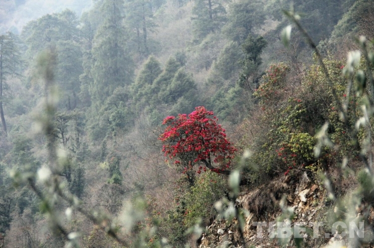 只見萬綠叢中一樹高山杜鵑盛開似火,