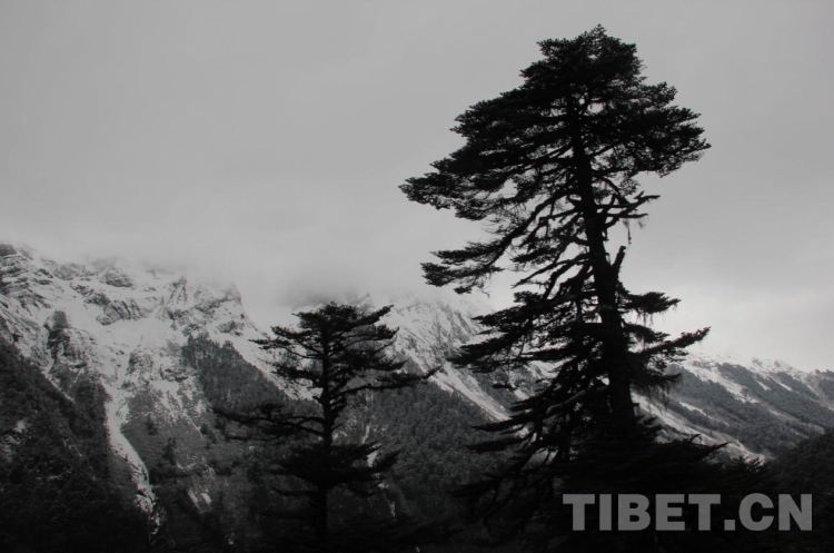 遙看蒼松欲與雪山比肩,