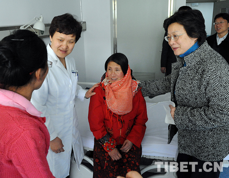 這是時(shí)任全國婦聯(lián)副主席甄硯(右一)受時(shí)任十一屆全國人大常委會(huì)副委員長陳至立委托,到北京口腔醫(yī)院看望斯求卓瑪,并送來慰問金(唐召明2010年4月14日攝)
