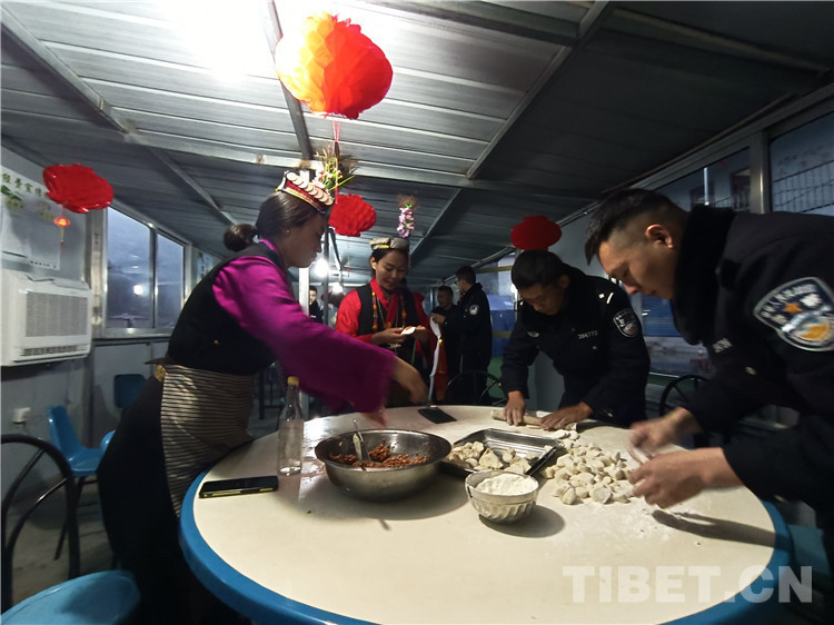 “阿久(藏語(yǔ)音譯:大叔),包餃子得講究手法,你要把餡放皮中央?!泵窬悋?guó)云邊講解邊演示,一個(gè)個(gè)餃子范本整整齊齊擺在托盤(pán)上。香腸、臘肉、餃子、羊肉、雞湯、糌粑、火鍋.....一桌藏漢式的年夜飯準(zhǔn)備完畢,大家圍坐在圓桌旁,舉杯共祝新春,濃濃的年味兒在夏爾巴第一村溢出,教導(dǎo)員康林感嘆道:“雖然春節(jié)不能回家,但是我們就是一個(gè)大家,祝大家新年快樂(lè),扎西德勒!”