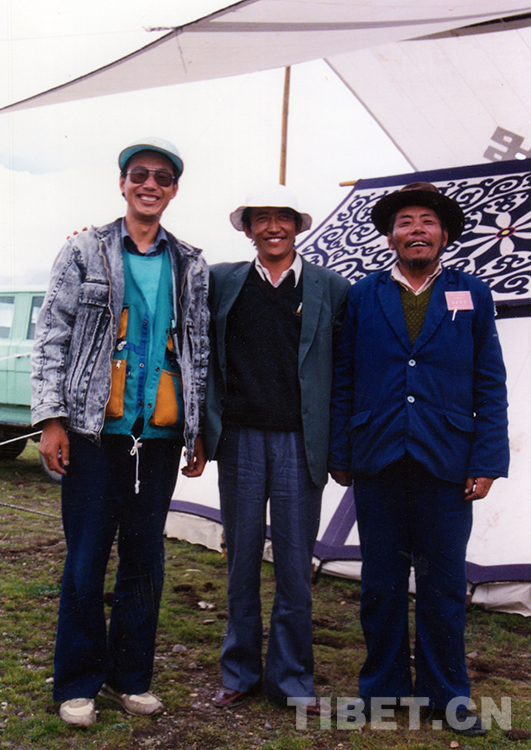 這是唐召明(左)與雙湖西亞爾公司經(jīng)理點(diǎn)達(dá)(右)在那曲賽馬會(huì)的帳篷前合影留念(桑瓊1987年攝)