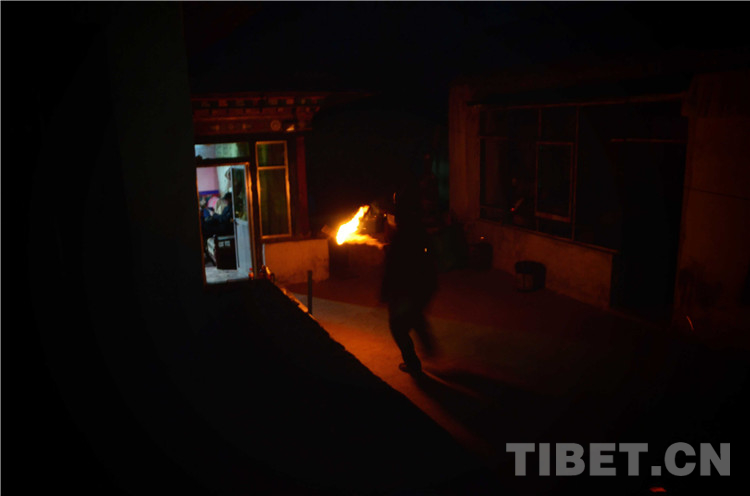 酒足飯飽后,“驅(qū)鬼”儀式開(kāi)始。家人們一起各自用糌粑從頭到腳觸碰一遍、捏下手印后,與故意吃剩的一點(diǎn)古突扔進(jìn)驅(qū)鬼盤,寓意將身心中的病痛與不詳全部拋掉。隨后查斯點(diǎn)燃火把,一邊喊著“所有妖魔都出去”,一邊手持火把跑往所有屋子各掃幾下,拿著火把和驅(qū)鬼盤到交叉路口焚燒掉。一路狂奔,且不能回頭。