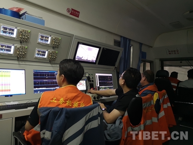 進(jìn)入拉林鐵路前,機(jī)組人員對鋼軌探傷車檢測裝置、走行及制動系統(tǒng)進(jìn)行了細(xì)致的檢查,對探傷系統(tǒng)及參數(shù)等進(jìn)行調(diào)試。探傷車前端,兩名司機(jī)緊盯前方,負(fù)責(zé)運行;探傷操作臺前,副隊長張全福及4名探傷人員不斷調(diào)整相關(guān)參數(shù),連續(xù)6個小時對檢測過的鋼軌數(shù)據(jù)進(jìn)行認(rèn)真盯控,通過數(shù)據(jù)變化判斷鋼軌是否存在傷損。