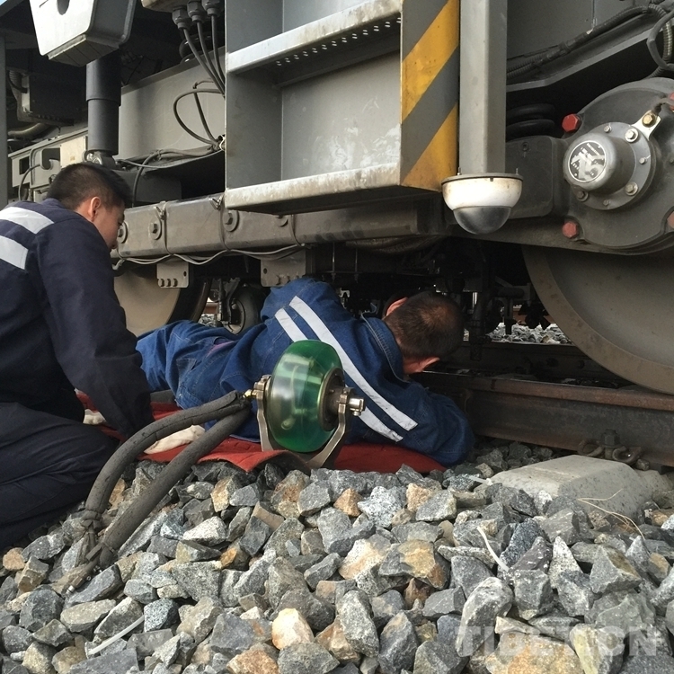 即將達(dá)到加查站時,探傷員余賢明發(fā)現(xiàn)探傷車左側(cè)第2個探輪有破損現(xiàn)象,需要更換探輪,大家立刻按照分工各就各位。隊長聯(lián)系集團(tuán)公司調(diào)度、加查站安排探傷車??寇囌?,設(shè)置好防護(hù)后,李生紅和余賢明立即鉆到車下拆卸破損探輪,崔成剛和李慧臣則準(zhǔn)備好新的探輪。四個人分工協(xié)作,在夜幕降臨之前將新的探輪安裝了上去。
