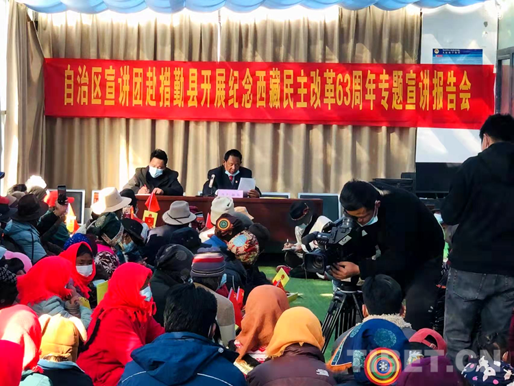 中國西藏網(wǎng)訊 3月26日,西藏自治區(qū)宣講團在阿里地區(qū)措勤縣扎日南木措社區(qū)黨群活動中心開展紀念西藏民主改革63周年專項宣講。扎日南木措社區(qū)黨群活動中心約200多名群眾參加。